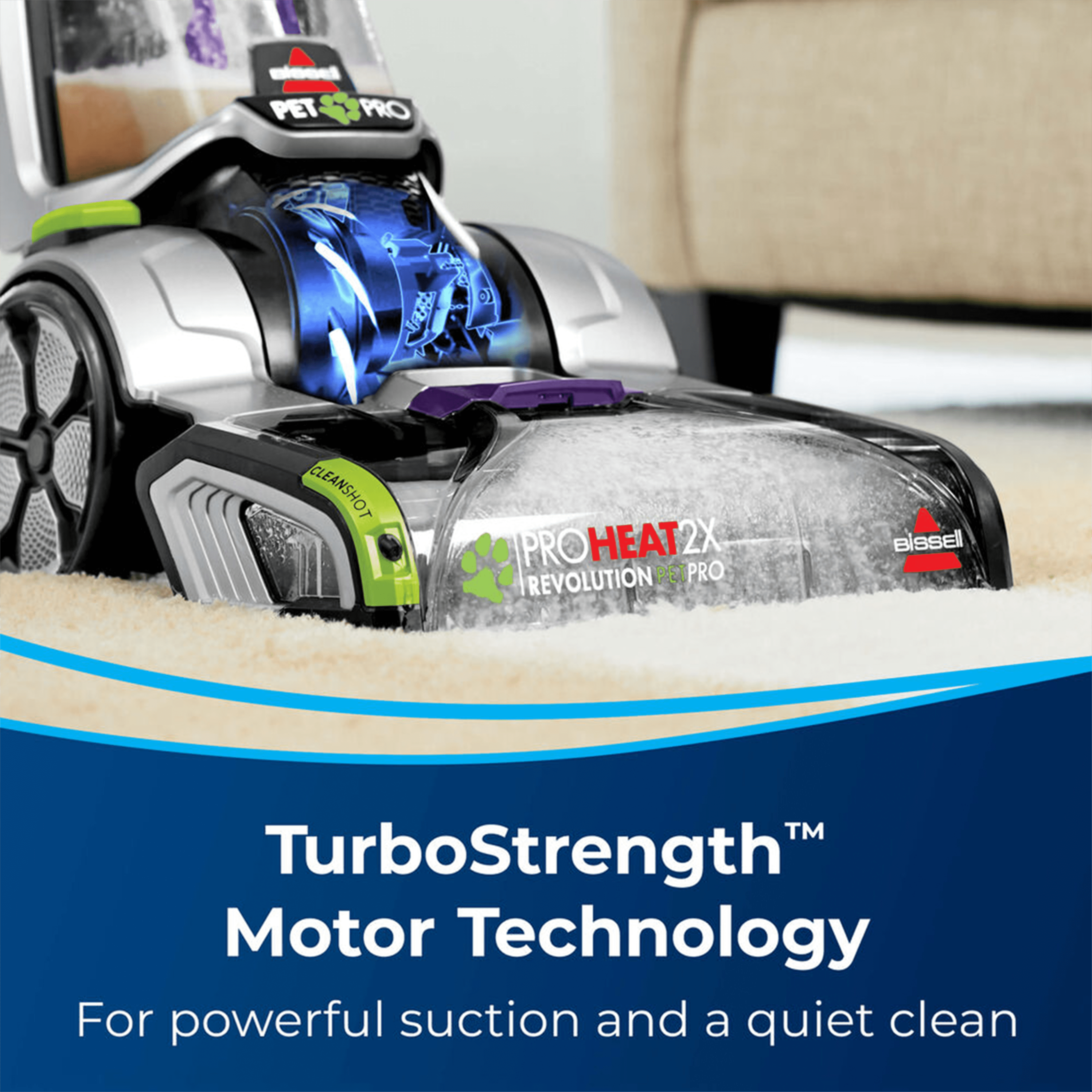 ProHeat 2X Revolution Pet features the performance, power, and technology to remove embedded dirt and tough stains. Our NEW TurboStrength Motor Technology delivers 40% more suction and a 50% quieter clean (compared to the previous model).